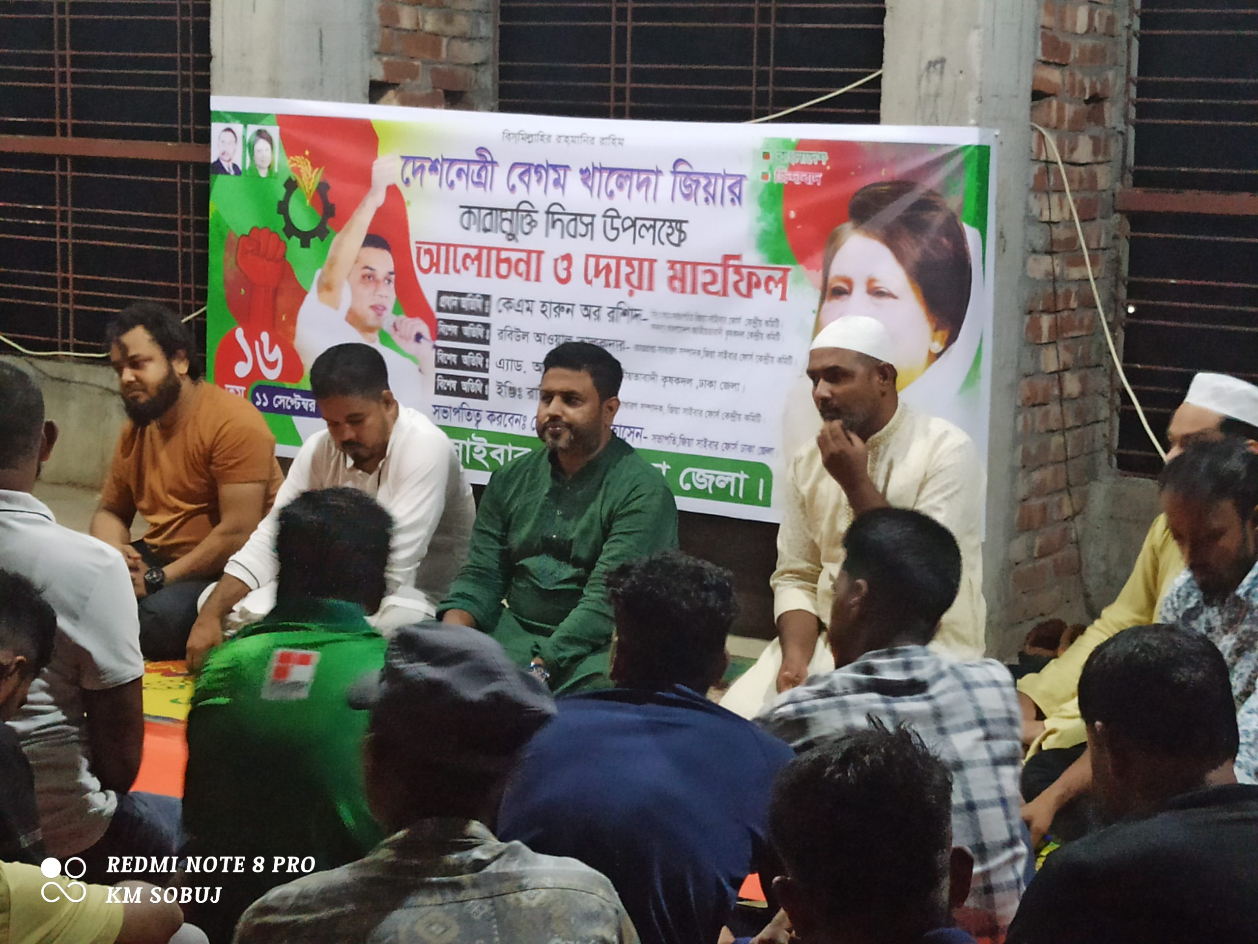 নিজস্ব প্রতিবেদকঃ বাংলাদেশ জাতীয়তাবাদী দল বিএনপির স্বেচ্ছাসেবী সংগঠন জিয়া সাইবার ফোর্স ঢাকা জেলা শাখার আয়োজনে বেগম খালেদা জিয়ার ১৬তম কারামুক্তি দিবস উপলক্ষে আলোচনা ও দোয়া মাহফিল করা হয়। উক্ত আলোচনা সভায় প্রধান অতিথি হিসাবে উপস্থিত ছিলেন, জিয়া সাইবার ফোর্সের সিনিয়র সহ-সভাপতি ও বাংলাদেশ জাতীয়তাবাদী কৃষকদলের সদস্য কেএম হারুন, বিশেষ অতিথি, জিয়া সাইবার ফোর্সের ভারপ্রাপ্ত সাধারণ সম্পাদক রবিউল আলম তালুকদার, যুগ্ম সম্পাদক রাজিব হাসান সহ প্রমুখ। এছাড়া ও অনুষ্ঠানটির সভাপতিত্ব করেন জিয়া সাইবার ফোর্স ঢাকা জেলার সভাপতি মোঃ মোশাররফ হোসেন ও সঞ্চালনায় ছিলেন, জিয়া সাইবার ফোর্সের ঢাকা জেলা কমিটির সাধারণ সম্পাদক মাসুদ রানা। সরকারের সমালোচনা করে প্রধান অতিথির বক্তব্যকালে কেএম হারুন বলেন, এলিভেটেড এক্সপ্রেসওয়ের আমাদের দেশের উন্নয়ন আর উন্নয়ন করা একটা দেশের সরকারের দায়িত্ব। উন্নয়নের নামে দেশের টাকা লোপাট করে গলাবাজির ও একদিন হিসাব নেওয়া হবে। সব শেষে বিএনপির চেয়ারপার্সন বেগম খালেদা জিয়ার রোগমুক্তি কামনায় বিশেষ দোয়া করা হয়।
