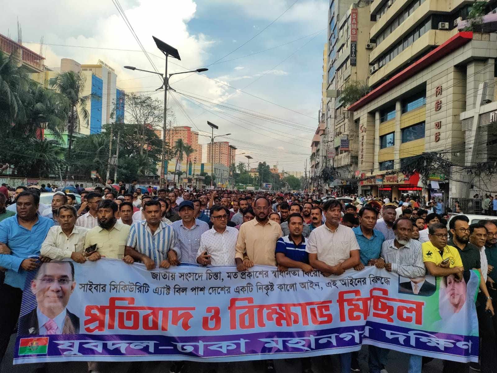 জাতীয় সংসদের চিন্তা, মত প্রকাশের স্বাধীনতা বিরোধী, সাইবার সিকিউরিটি এ্যাক্ট বিল পাশ, দেশের একটি কালো আইন, এই আইনের বিরুদ্ধে প্রতিবাদ ও বিক্ষোভ মিছিল অনুষ্ঠিত হয়।