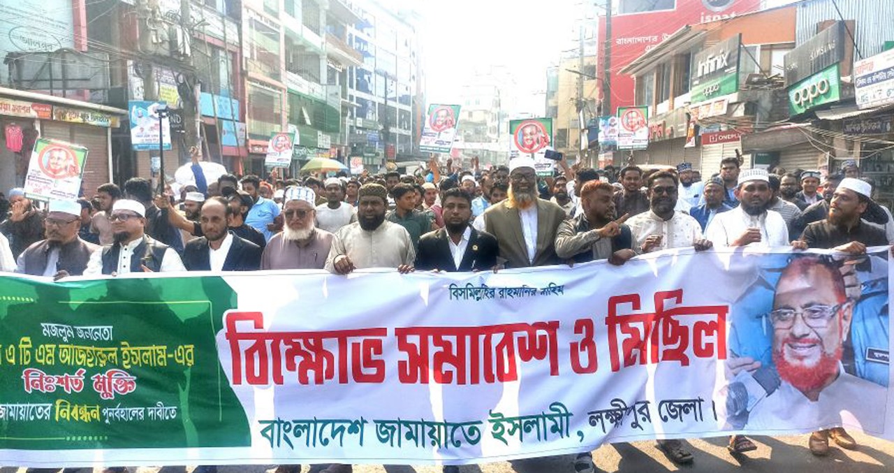 ফরহাদ হোসাইন (লক্ষ্মীপুর) প্রতিনিধি: বাংলাদেশ জামায়াতে ইসলামীর সহকারী সেক্রেটারী জেনারেল এটিএম আজহারুল ইসলামের মুক্তি ও জামায়াতের নিবন্ধন পুণর্বহালের দাবিতে লক্ষ্মীপুরে বিক্ষোভ সমাবেশ ও মিছিল অনুষ্ঠিত হয়েছে।মঙ্গলবার (১৮ ফেব্রুয়ারী) সকালে জামায়াত ইসলামী লক্ষ্মীপুর জেলা শাখার আয়োজনে কেন্দ্র ঘোষিত দেশব্যাপী বিক্ষোভ কর্মসূচির অংশ হিসেবে লক্ষ্মীপুর শহরের চকবাজার জামে মসজিদ এলাকায় বিক্ষোভ সমাবেশের আয়োজন করা হয়।এ সমাবেশে প্রধান অতিথি হিসেবে বক্তব্য রাখেন জেলা জামায়াতের আমীর মাষ্টার রুহুল আমিন ভূঁইয়া, বিশেষ অতিথি হিসেবে বক্তব্য রাখেন জেলা জামায়াতের নায়েবে আমীর এডভোকেট নজির আহম্মদ, এ আর হাফিজ উল্লাহ, জেলা সেক্রেটারী মাওলানা ফারুক হোসাইন নুরনবী, সহকারী সেক্রেটারী মাওলানা নাছির উদ্দীন, এডভোকেট মহসিন কবীর মুরাদ, শ্রমিক কল্যান ফেডারেশনের সভাপতি মমিন উল্যাহ পাটওয়ারী, ছাত্র শিবিরের লক্ষ্মীপুর শহর শাখার সভাপতি ফরিদ উদ্দিন, সেক্রেটারী আব্দুল আউয়াল হামদু, শহর জামায়াতের আমীর এডভোকেট আবুল ফারাহ নিশান প্রমুখ।সমাবেশে বক্তারা বলেন, দেশবাসী আশা করেছিল যে, চরম জুলুম-নির্যাতনের শিকার এটিএম আজহারুল ইসলাম স্বৈরাচার মুক্ত বাংলাদেশে মুক্তিলাভ করবেন। কিন্তু অন্তর্বর্তী সরকার ক্ষমতা গ্রহণের ৬ মাসেরও বেশি সময় অতিবাহিত হওয়া সত্ত্বেও এটিএম আজহারুল ইসলামকে মুক্তি দেওয়া হয়নি। ফ্যাসিস্ট শেখ হাসিনার শাসনামলের বিচারিক কার্যক্রমসমূহ সারা বিশ্বে বিতর্কিত, প্রশ্নবিদ্ধ ও প্রত্যাখ্যাত। স্বৈরাচারের আমলে গ্রেপ্তারকৃত এটিএম আজহারুল ইসলামকে কারাগারে আটক রাখা তার প্রতি চরম জুলুম ও অন্যায় ছাড়া আর কিছুই নয়। ফ্যাসিবাদমুক্ত বাংলাদেশে তাকে এখনো আটক রাখায় জাতি বিস্মিত ও হতবাক। অবিলম্বে জামায়াত নেতা এটিএম আজহারুল ইসলামকে মুক্তি ও জামায়াতের নিবন্ধন ফিরিয়ে না দিলে অন্তর্বর্তী সরকারের বিরুদ্ধে কঠোর কর্মসূচি দেওয়ার ঘোষণা দেন বক্তারা।উক্ত মিছিল ও সমাবেশে আরো উপস্থিত ছিলেন বাংলাদেশ জামায়াত ইসলামীর জেলা কর্মপরিষদের সদস্য সরদার সৈয়দ আহম্মেদ, শামসুল ইসলাম, মাওলানা হুমায়ুন কবির, মাষ্টার মমিনুল হক, অধ্যাপক মিজানুর রহমান, জামায়াত নেতা মাওলানা নুর মোহাম্মদ রাসেল, মাওলানা জহিরুল ইসলাম, এডভোকেট আবদুল আউয়াল রাসেল, হারুনর রশীদ, ফয়েজ আহমেদ, এডভোকেট রেজাউল করিম সুমন, মঞ্জুরুল ইসলাম মিরন সহ নেতৃবৃন্দ।পরে সমাবেশ শেষে একটি বিশাল বিক্ষোভ মিছিল শহরের প্রধান প্রধান সড়ক প্রদক্ষিণ করে উত্তর তেমুহনী হয়ে ডিসি চত্বরে গিয়ে শেষ হয়। মিছিলে জামায়াত ইসলামী সহ সহযোগী সংগঠন ও ইসলামী ছাত্র শিবিরের হাজারো নেতাকর্মী অংশগ্রহণ করে।
