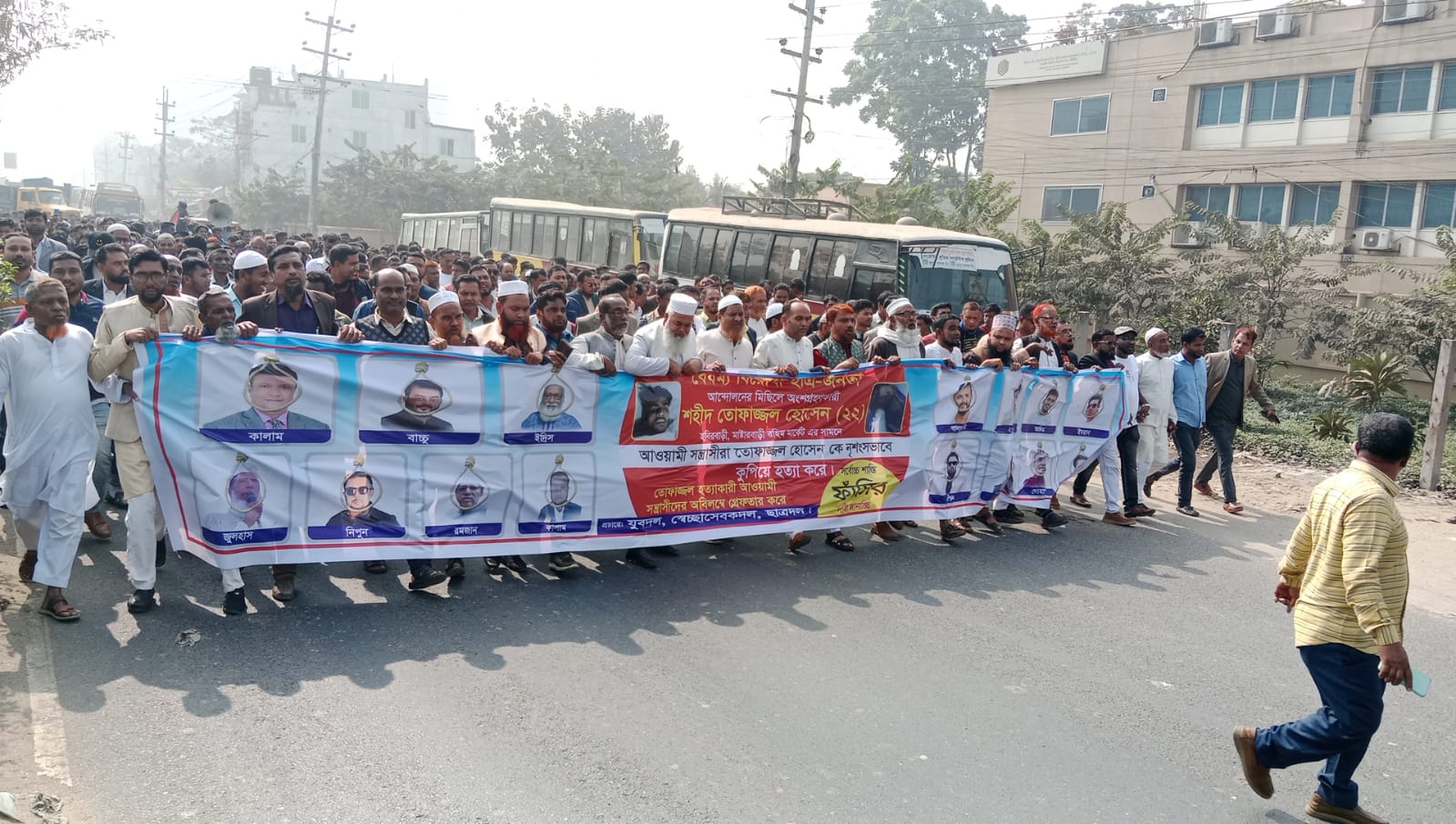 ভালুকায় শহীদ তোফাজ্জল হোসেনের হত্যাকারীদের ফাসির দাবিতে বিক্ষোভ মিছিল