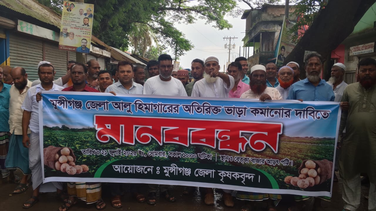 আপন সরদার (মুন্সীগঞ্জ) প্রতিনিধি: মুন্সীগঞ্জে হিমাগারে আলুর বস্তা সংরক্ষণ ভাড়া কমানোর দাবীতে জেলার আলুচাষী,আড়তদার ও স্থানীয় এলাকাবাসী মানববন্ধন করেছে। সোমবার সকাল ১০:৩০ মিনিটে মুন্সীগঞ্জের টঙ্গীবাড়ী উপজেলার বেতকা বাজারে ঘন্টাব্যাপী এ মানববন্ধন কর্মসূচি পালন করে তারা। এসময় বক্তারা বলেন,এমনিতেই এবছর আলুর দাম কম তার উপর হিমাগারের ভাড়া অযৌক্তিক ভাবে বাড়িয়ে দিয়েছে এতে আমাদের দেশের কৃষকরা মারাত্মক ক্ষতিতে পরেছে। এইবছর প্রতি কজি আলুতে ৩০-৪০ টাকা খরচ হয়েছে অথচ এখন বাজারে ৬-৭ টাকায় বিক্রি করতে হচ্ছে। এতে লোকসানের উপর লোকসান গুনতে হচ্ছে। হিমাগারের বাড়তি ভাড়া বাতিল করে আগের ভাড়া বহালের দাবী জানান মানববন্ধনকারীরা।