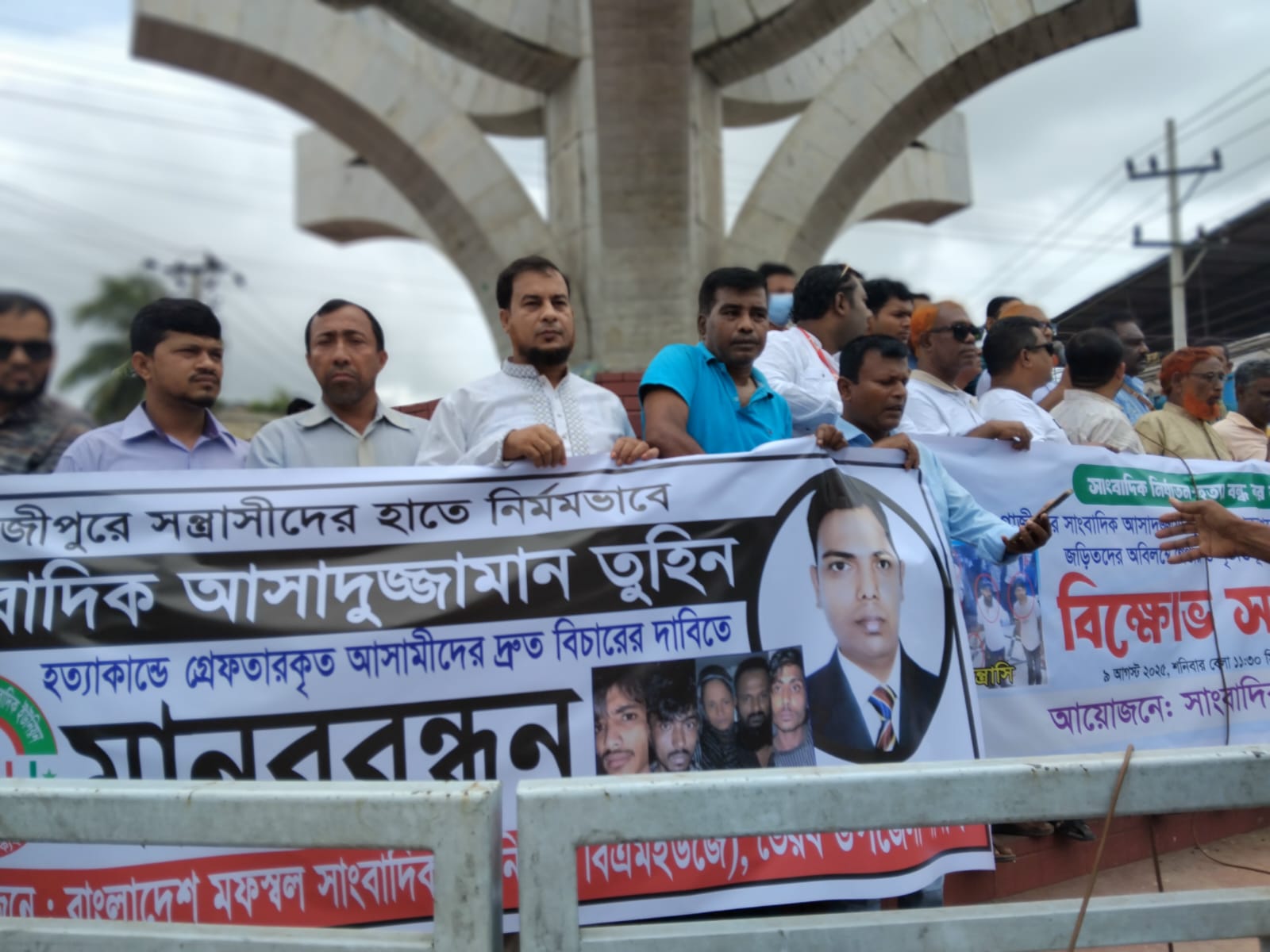 তারা নিহত সাংবাদিক আসাদুজ্জামান তুহিনের হত্যাকারীদের দৃষ্টান্তমূলক শাস্তিসহ সকল সাংবাদিক হত্যা ও নির্যাতনের বিরুদ্ধে দ্রুত ব্যবস্থা গ্রহণের দাবি জানান।সমাবেশে বক্তব্য রাখেন তাজুল ইসলাম তাজভৈরবী, আসাদুজ্জামান ফারুক, সোহেলুর রহমান, সুমন মোল্লা, তুহিন মোল্লা, এম.আর সোহেল সেন, আলাল উদ্দিন, দিদার হোসেন পিন্টু, ডা. লতিফ, আক্তারুজ্জামান, নজরুল ইসলাম রিপন, এমএ হালিম, হাজী সজীব, সোহানুর রহমান,মোঃ ছাবির উদ্দিন রাজু প্রমুখ।