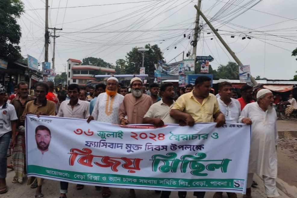 মঙ্গলবার (৫ আগষ্ট) বিকেল ৫.৩০ মিনিটের সময় বেড়া কানাই বাড়ি মোরে সংক্ষিপ্ত আলোচনা সভা শেষে বিজয় মিছিলটি শুরু করে সিএনবি বাস স্ট্যান্ড, বেড়া বাজার প্রদক্ষিণ করে রিক্সা ভ্যান সমবায় সমিতির কার্যালয়ে সামনে শেষ হয়। এতে বেড়া রিক্সা ভ্যান সমবায় সমিতির বেড়া পৌর শাখা, ইউনিয়ন, ওয়ার্ডের নেতৃবৃন্দ ও ভ্যান রিক্সা চালক কয়েকশত মানুষ অংশ নেয়।