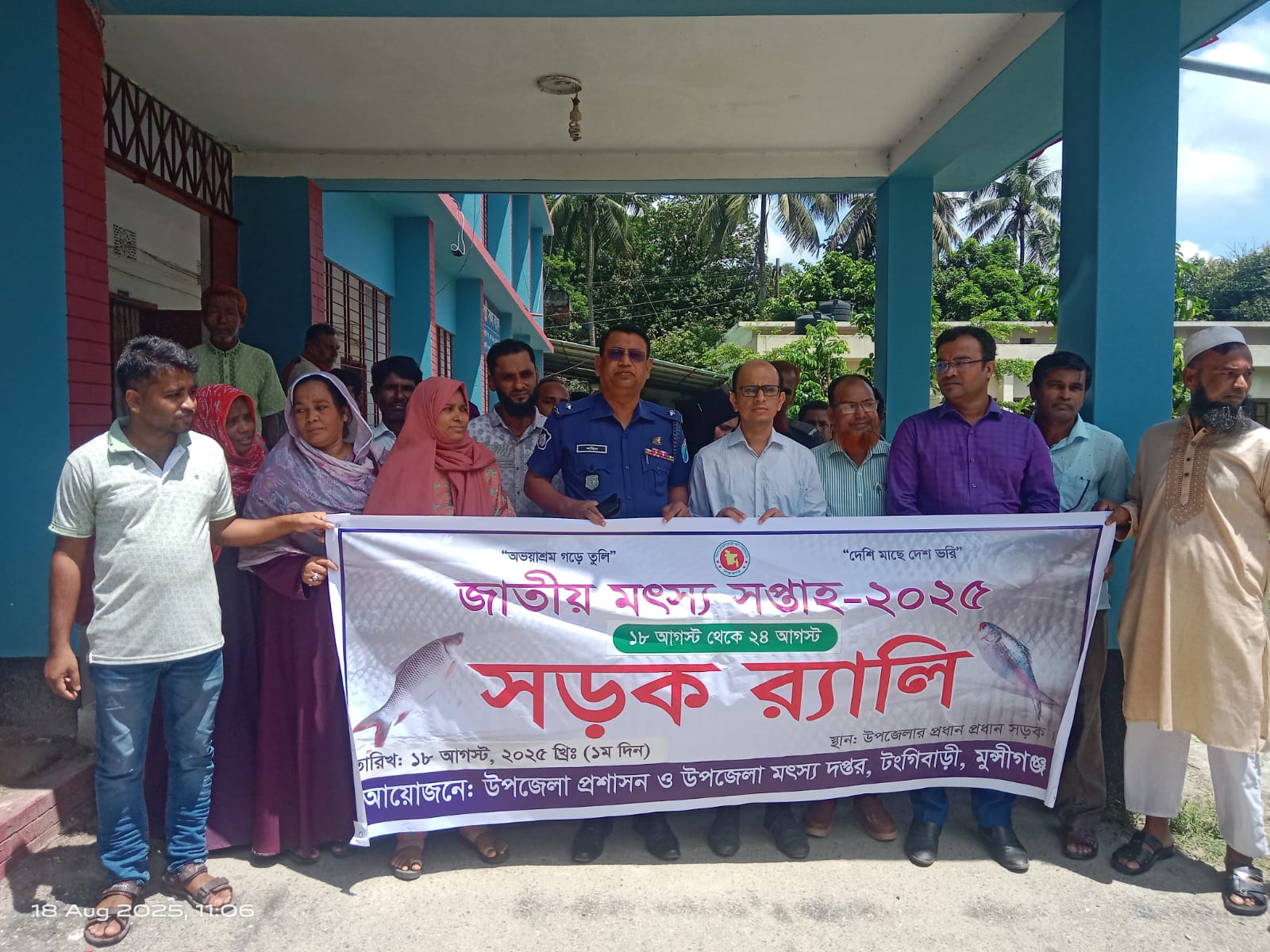 টঙ্গীবাড়ী প্রতিনিধি: অভয়াশ্রম গড়ে তুলি,দেশী মাছে দেশ ভরি এই প্রতিপাদ্যকে সামনে রেখে জাতীয় মৎস্য সপ্তাহ ২০২৫ ইং উপলক্ষে মুন্সীগঞ্জের টঙ্গীবাড়ীতে পোনা মাছ অবমুক্ত, র্যালী,আলোচনা সভা ও পুরষ্কার বিতরনী অনুষ্ঠান অনুষ্ঠিত হয়েছে। উপজেলা প্রশাসন ও মৎস্য অধিদপ্তরের আয়োজনে সোমবার (১৮আগস্ট) বেলা ১১ টায় উপজেলা পুকুরে বিভিন্ন প্রজাতির মাছের পোনা অবমুক্ত করা হয় পরে উপজেলা পরিষদের মাঠ থেকে একটি র্যালী বের হয়। র্যালীটি উপজেলার গুরুত্বপূর্ণ স্থান প্রদক্ষিণ করে পুনরায় উপজেলা মাঠে এসে শেষ হয়। উপজেলা সভাকক্ষে আলোচনা সভা অনুষ্ঠিত হয়। উপজেলা নির্বাহী কর্মকর্তা মোস্তাফিজুর রহমান এর সভাপতিত্বে ও উপজেলা মৎস কর্মকর্তা মোসাম্মত নিগার সুলতানার সঞ্চালনায় আলোচনা সভায় উপস্থিত ছিলেন টঙ্গিবাড়ী থানার অফিসার ইনর্চাজ মো.মহিদুল ইসলাম, উপজেলা কৃষি কর্মকর্তা পৃতীশ চঁন্দ্র পাল,উপজেলা প্রকল্প বাস্তবায়ন কর্মকর্তা স্বপন মাতাব্বর,উপজেলা যুবউন্নয়ন কর্মকর্তা মো.শাহজান, মাধ্যমিক শিক্ষা কর্মকর্তা শরীফ মো: মোর্তজা এহসান, উপজেলা জনস্বাস্থ্য সহকারী প্রকৌশলী হুমায়ুন আহাম্মেদ,টঙ্গীবাড়ী প্রেসক্লাবের সভাপতি মো. মোজাফফর হোসেন শেখ, আনসার বিটিভি কর্মকর্তা কারিনা বেগম সহ বিভিন্ন দপ্তরের কর্মকর্তা সহ আড়তদার, ব্যবসায়ী ও মৎস্য চাষীবৃন্দ।