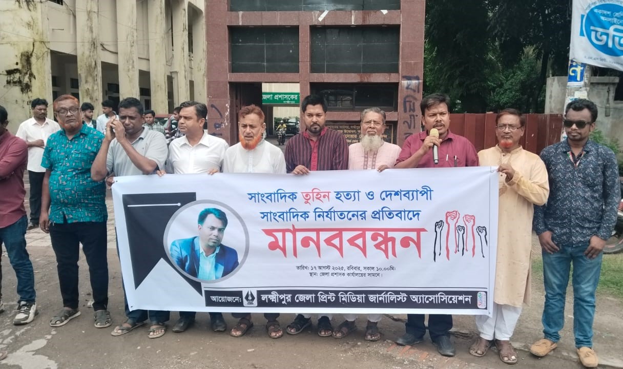 সাংবাদিক তুহিন হত্যা ও দেশব্যাপী সাংবাদিকদের উপর নির্যাতনের প্রতিবাদে লক্ষ্মীপুর জেলা প্রিন্ট মিডিয়া জার্নালিস্ট অ্যাসোসিয়েশন এর ব্যানারে মানববন্ধনে বক্তারা এসব কথা বলেন।বক্তারা আরো বলেন,-‘রাষ্ট্র সাংবাদিকদের উপর জারি করা কালো আইন বাতিল করে দায়িত্ব পালন উন্মুক্ত করে দেয়া উচিত। নইলে দেশে আইনশৃঙ্খলার চরম অবনতি হবে, দুর্নীতি লুটপাট ও চরম অনিয়মে ভরে যাবে। সে কারণে সাংবাদিকদের সুরক্ষা দেয়া, দায়িত্ব পালন উন্মুক্ত করে দেয়া রাষ্ট্রের দায়িত্ব ও কর্তব্য।’