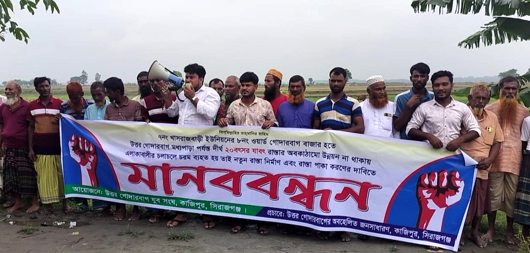 সিরাজগঞ্জ প্রতিনিধি:   দীর্ঘ দুই দশক ধরে রাস্তাঘাটের বেহাল দশা, নেই কোনো উন্নয়নের ছোঁয়া—এই বাস্তবতার বিরুদ্ধে প্রতিবাদে ফেটে পড়েছে সিরাজগঞ্জের কাজিপুর উপজেলার ৭নং খাসরাজবাড়ী ইউনিয়নের উত্তর গোদারবাগের জনসাধারণ।আজ সোমবার (৪ আগস্ট) সকালে উত্তর গোদারবাগ বাজারে আয়োজিত এক শান্তিপূর্ণ মানববন্ধনে অংশ নেন শতাধিক স্থানীয় বাসিন্দা। তারা জানান, খাসরাজবাড়ী ইউনিয়নের ৮নং ওয়ার্ডের গোদারবাগ বাজার থেকে ফকিরপাড়া পর্যন্ত প্রায় ৩ কিঃমিঃ রাস্তাটি গত ২০ বছর ধরে সংস্কারের মুখ দেখেনি। কাঁচা এবং ভাঙাচোরা এই রাস্তায় বর্ষা মৌসুমে হাঁটাচলা করাই দুঃসাধ্য হয়ে পড়ে।