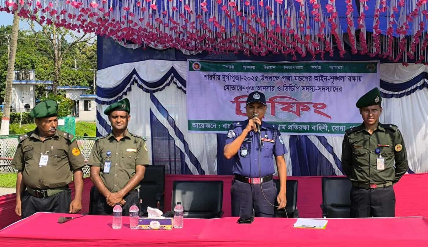 দায়িত্বকালে মোবাইল ফোনে অযথা সময় নষ্ট না করা এবং সর্বোপরি সতর্কতার সঙ্গে নিজ দায়িত্ব পালন করা। এ সময় উপজেলা আনসার ভিডিপি কর্মকর্তা, থানা পুলিশ সদস্যবৃন্দসহ স্থানীয় প্রশাসনের অন্যান্য কর্মকর্তারা উপস্থিত ছিলেন।উল্লেখ্য, আসন্ন দুর্গা পূজায় বোদা উপজেলার বিভিন্ন ইউনিয়নে প্রায় শতাধিক পূজা মণ্ডপে দেবী দুর্গার প্রতিমা প্রতিষ্ঠা করা হবে। পূজা মণ্ডপগুলোতে সুষ্ঠু ও শান্তিপূর্ণ পরিবেশ বজায় রাখতে প্রশাসনের পক্ষ থেকে সর্বাত্মক প্রস্তুতি গ্রহণ করা হয়েছে।
