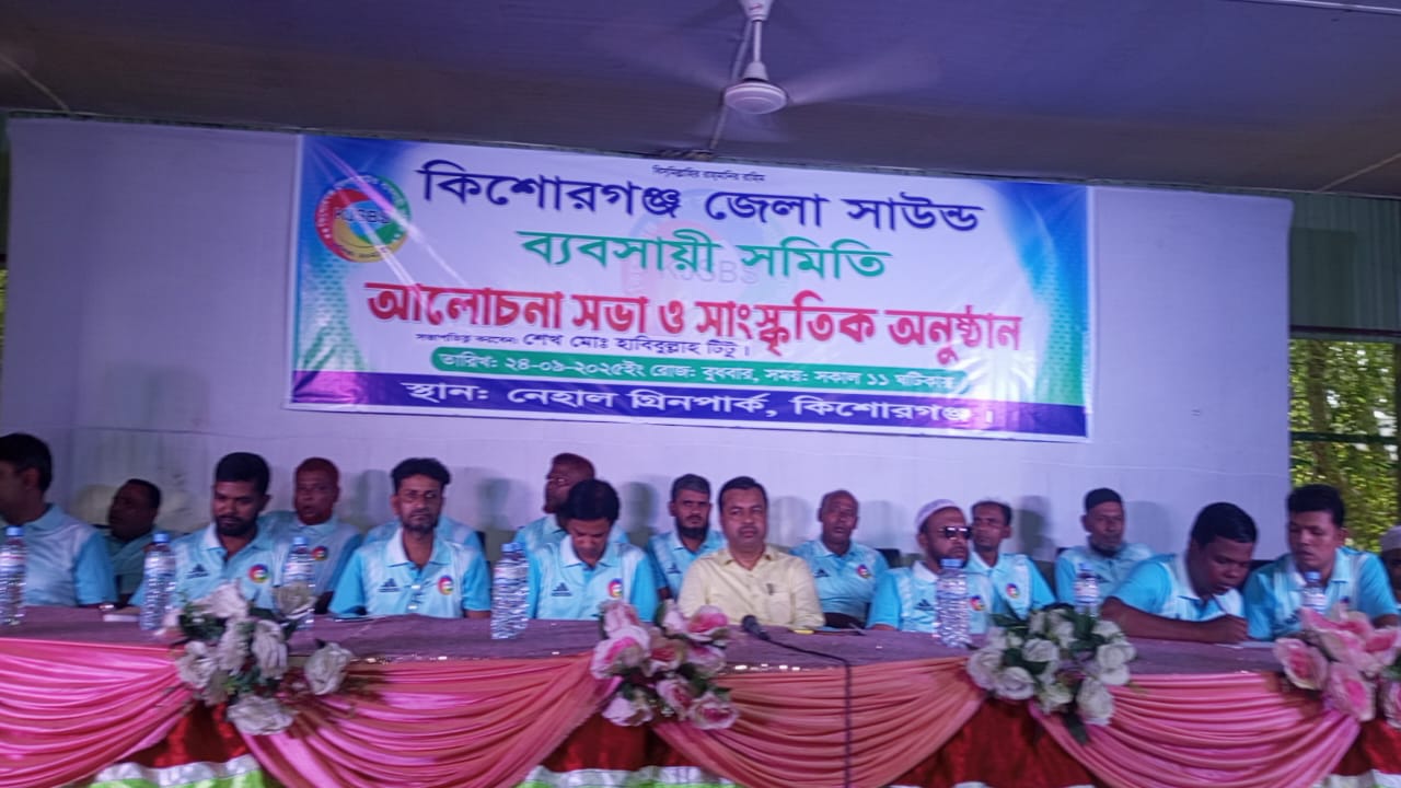 কিশোরগঞ্জ জেলা সাউন্ড ব্যবসায়ী সমিতির সভাপতি শেখ মো. হাবিবুল্লাহ টিটুর সভাপতিত্বে ও মো. সুমন মিয়ার সঞ্চালনায় বক্তব্য রাখেন সমিতির প্রধান উপদেষ্টা মো. পাপ্পু মিয়া, পার্থ শাহা, মো. আবদুল মালেক, মো. আলতাফ মিয়া, সহ-সভাপতি মো. জহিরুল ইসলাম খোকন, সুমন চৌহান, সাধারণ সম্পাদক শামীম শান্ত, সাংগঠনিক সম্পাদক ইমরান, দপ্তর সম্পাদক নয়ন শাহা, কটিয়াদী উপজেলা সভাপতি মো. আলম, সাংস্কৃতিক সম্পাদক নান্টু শাহা, কার্যকরী সদস্য আল আমিন, মো. শহিদুল্লাহ, মো. বাবুলসহ সমিতির অন্যান্য নেতৃবৃন্দ।আলোচনা সভা শেষে এক মনোজ্ঞ সাংস্কৃতিক অনুষ্ঠানের আয়োজন করা হয়।