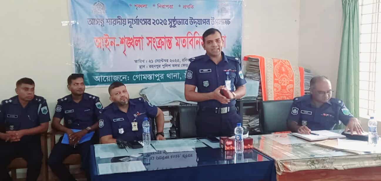 চাঁপাইনবাবগঞ্জ প্রতিনিধি:    চাঁপাইনবাবগঞ্জের গোমস্তাপুরে আসন্ন শারদীয় দূর্গোৎসব ২০২৫ উদযাপন উপলক্ষে গোমস্তাপুরে আইন-শৃঙ্খলা সংক্রান্ত মতবিনিময় সভা অনুষ্ঠিত হয়েছে।রবিবার ( ২১ সেপ্টেম্বর) বেলা ১১ টায় গোমস্তাপুর থানা পুলিশের আয়োজনে রহনপুর পুলিশ তদন্ত কেন্দ্রে এই মতবিনিময় সভায় সভাপতিত্ব করেন গোমস্তাপুর থানার অফিসার ইনচার্জ, ওয়াদূদ আলম, এতে প্রধান অতিথি হিসেবে উপস্থিত ছিলেন,অতিরিক্ত পুলিশ সুপার গোমস্তাপুর সার্কেল হাসান তারেক,