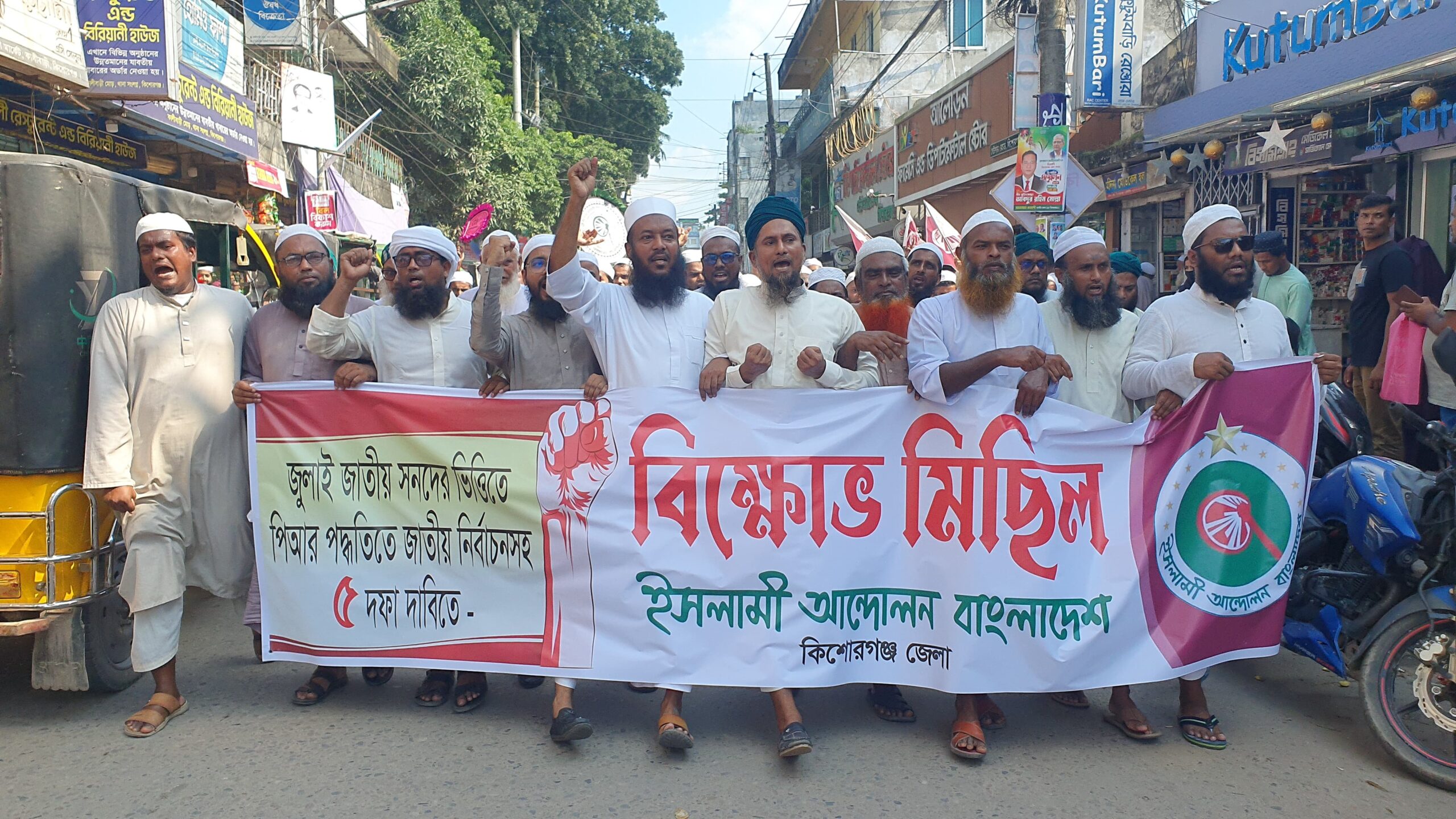 কিশোরগঞ্জ প্রতিনিধি:    পিআর (প্রতিনিধিত্বমূলক) পদ্ধতিসহ পাঁচ দফা দাবিতে ইসলামী আন্দোলন বাংলাদেশ (আইএবি) আয়োজিত স্মরণকালের সর্ববৃহৎ বিক্ষোভ মিছিল কিশোরগঞ্জে অনুষ্ঠিত হয়েছে।শুক্রবার (২৬ সেপ্টেম্বর ২০২৫) জুমার নামাজের পর ঐতিহাসিক শহীদী মসজিদের চত্বর থেকে মিছিলটি শুরু হয়ে শহরের বিভিন্ন সড়ক প্রদক্ষিণ করে পুরানথানা মোড়ে গিয়ে শেষ হয়।মিছিল-পরবর্তী সমাবেশে বক্তব্য রাখেন ইসলামী আন্দোলন বাংলাদেশ কিশোরগঞ্জ জেলা শাখার প্রধান উপদেষ্টা জননেতা প্রফেসর হাফেজ মাওলানা আজিজুর রহমান জার্মানি এবং জেলা সভাপতি প্রভাষক হাফেজ মাওলানা আলমগীর হোসাইন তালুকদার।