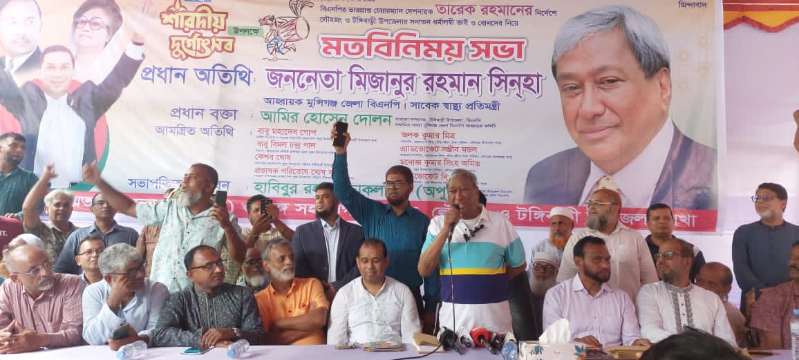 মুন্সীগঞ্জ প্রতিনিধি: মুন্সীগঞ্জের লৌহজংয়ে শারদীয় দুর্গোৎসব উপলক্ষে টঙ্গিবাড়ী ও লৌহজং উপজেলার সনাতন ধর্মাবলম্বীদের নিয়ে মত বিনিময় সভা অনুষ্ঠিত হয়েছে।সোমবার (২২ সেপ্টেম্বর) সকালে উপজেলার কলমা ইউনিয়নের মিজানুর রহমান সিনহার বাড়িতে এ মতবিনিময় সভা অনুষ্ঠিত হয়েছে।সভায় প্রধান অতিথি হিসেবে উপস্থিত ছিলেন মুন্সীগঞ্জ জেলা বিএনপির আহবায়ক ও সাবেক স্বাস্থ্য প্রতিমন্ত্রী মিজানুর রহমান সিনহা।প্রধান বক্তা হিসেবে উপস্থিত ছিলেন জেলা বিএনপির আহবায়ক কমিটির সদস্য ও টঙ্গিবাড়ী উপজেলা বিএনপির সাধারণ সম্পাদক আমির হোসেন দোলন।