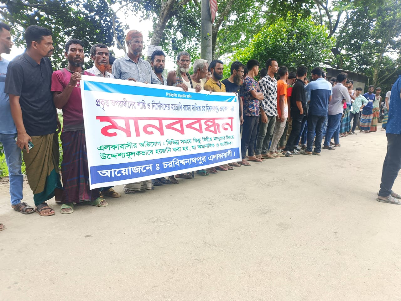 তারা বলেন, স্কুল-কলেজে সংঘটিত কিছু ঝগড়া বা সামাজিক ঘটনার সঙ্গে সম্পৃক্ত না থাকা সত্ত্বেও চরবিশ্বনাথপুর এলাকার নির্দোষ মানুষদের মিথ্যা মামলায় জড়ানো হচ্ছে।বক্তারা আরও অভিযোগ করেন, সিধলা ইউনিয়ন যুবদলের সভাপতি মাজহারকে কোনো সম্পৃক্ততা ছাড়াই অন্যায়ভাবে হয়রানি করা হচ্ছে, যা রাজনৈতিক প্রতিহিংসার বহিঃপ্রকাশ হতে পারে।মানববন্ধনে অংশগ্রহণকারী এলাকাবাসী প্রশাসনের প্রতি আহ্বান জানান— প্রকৃত অপরাধীদের চিহ্নিত করে আইনের আওতায় আনা হোক এবং নির্দোষ ও নিরীহ মানুষদের হয়রানি বন্ধ করা হোক।