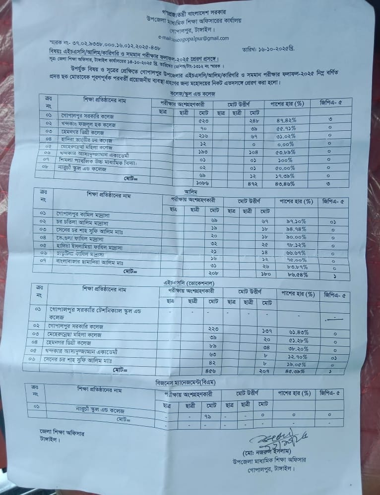 এইচএসসি (ভোকেশনাল)পর্যায়ে ৬ টি প্রতিষ্ঠানের মোট পরীক্ষার্থী ছিল ৪৫৬ জন।সেখানে পাশ করেছে ২০৭ জন।এতে পাশের হার হচ্ছে ৪৫.৩৯% ভাগ। জিপিএ-৫-পেয়েছে ১ জন।গোপালপুর উপজেলার বিজনেস ম্যানেজমেন্ট( বি.এম) পর্যায়ে একটি মাত্র কলেজ নারুচী স্কুল এন্ড কলেজ। এই প্রতিষ্ঠান থেকে পরীক্ষায় অংশগ্রহণ করেছিল ৭৯ জন শিক্ষার্থী।তার মধ্যে কেউ পাশ করেনি।একমাত্র মাদ্রাসার আলিম পরীক্ষার্থীদের পাশের হার ভালো থাকলেও জিপিএ-৫ পেয়েছে মাত্র ১ জন।