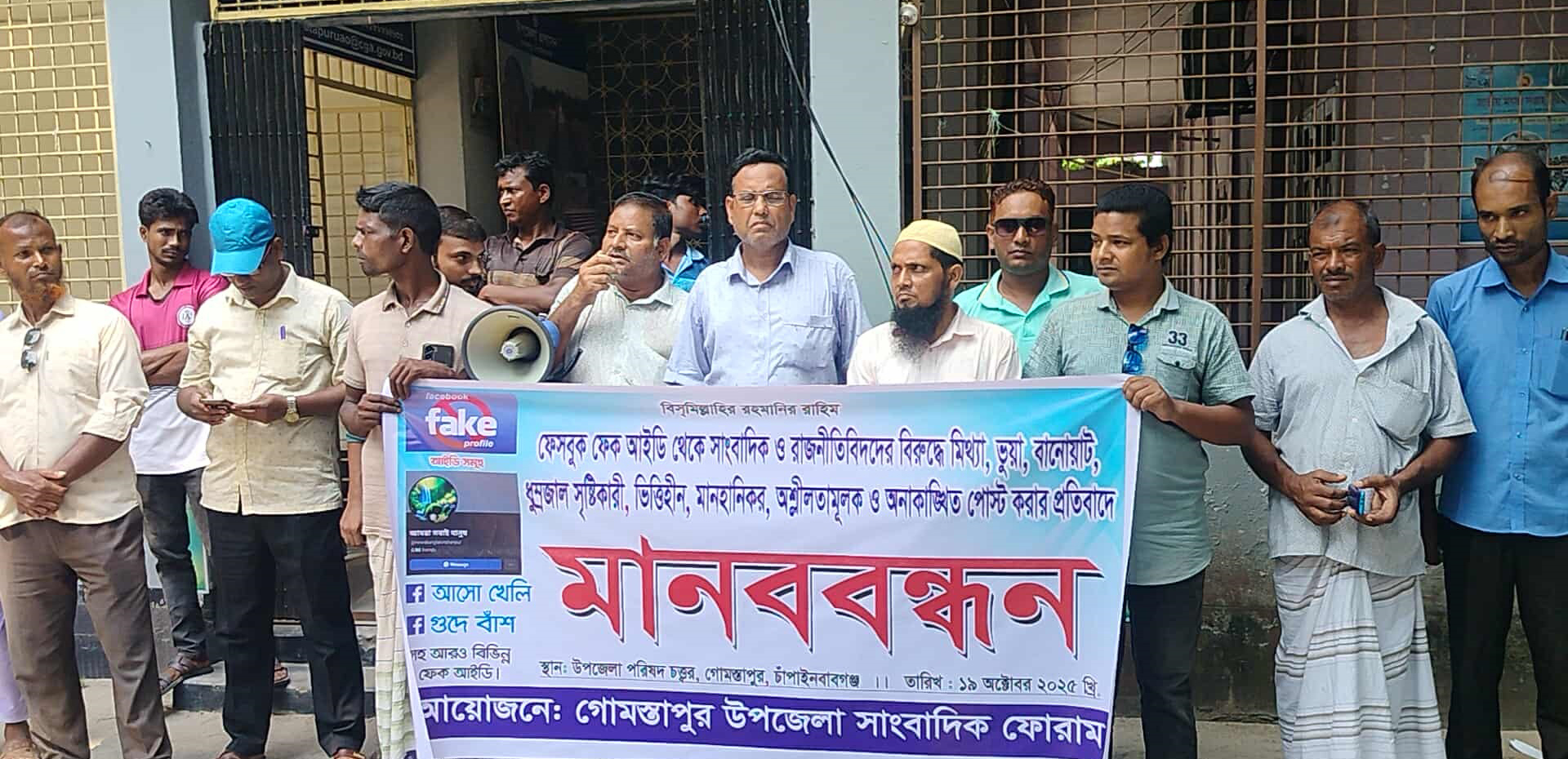 রবিবার সকালে গোমস্তাপুর উপজেলা সাংবাদিক ফোরামের আয়োজনে গোমস্তাপুর উপজেলা পরিষদ চত্ত্বরে মানববন্ধনে বক্তারা বলেন, এসব ফেক আইডির সাথে যারা জড়িত তাদের দ্রুত আইনের আওতায় এনে দৃষ্টান্তমূলক শাস্তির দাবি জানান। যাতে করে পরবর্তীতে এরকমভাবে আর কোন মানুষের সম্মান নিয়ে খেলার সাহস কেউ না পায় ফেক আইডি খুলে। ফেক আইডি গুলো হলো আমরা সবাই মানুষ, আসো খেলি, গুদে বাঁশ সহ বিভিন্ন অদ্ভুত নামের ফেক আইডি।