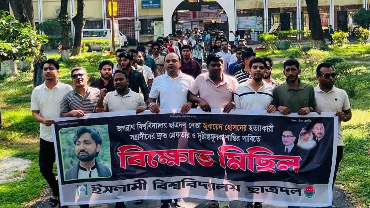 ইবি প্রতিনিধি: জগন্নাথ বিশ্ববিদ্যালয়ের শাখা ছাত্রদলের আহ্বায়ক কমিটির সদস্য জুবায়েদ হোসাইনের হত্যাকারীদের দ্রুত গ্রেফতার ও শাস্তির দাবিতে বিক্ষোভ মিছিল করেছে ইসলামী বিশ্ববিদ্যালয় শাখা ছাত্রদল।সোমবার (২০ অক্টোবর) দুপুর দেড়টায় এ কর্মসূচি পালন করে তারা। বিক্ষোভ মিছিলটি বিশ্ববিদ্যালয়ের অনুষদ ভবন থেকে শুরু হয় ও ক্যাম্পাসের বিভিন্ন সড়ক প্রদক্ষিণ করে প্রশাসন ভবনের সামনে বিক্ষোভ সমাবেশে মিলিত হয়।মিছিলে নেতাকর্মীরা “ক্যাম্পাসে লাশ পড়ে, ইন্টেরিম কি করে?”, “আমার ভাই কবরে, খুনি কেন বাহিরে”, “খুন হয়েছে আমার ভাই , ঘরে থাকার সময় নাই”, “আমার ভাই মরলো কেন, ইন্টেরিম জবাব দে”, “জিয়ার সৈনিক, এক হও লড়াই করো”, “জাতীয়তাবাদী ছাত্রদল, জিন্দাবাদ জিন্দাবাদ”, “একশান টু একশান, ডাইরেক্ট একশান”, “ছাত্রদলের একশান, ডাইরেক্ট একশান”, “ফাঁসি ফাঁসি ফাঁসি চাই, খুনিদের ফাঁসি চাই”, ইত্যাদি স্লোগান দেন তারা।