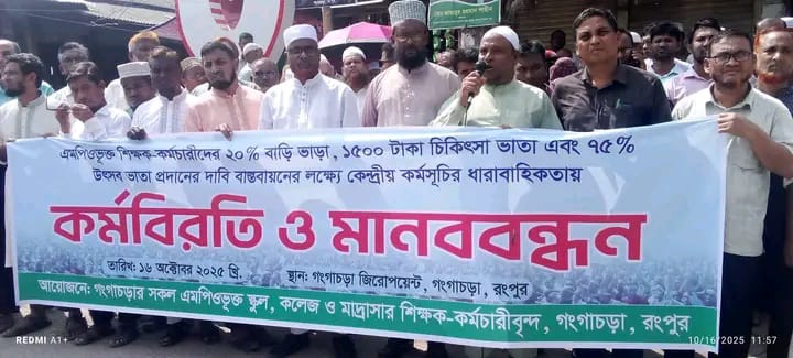 রংপুর প্রতিনিধি: সারা দেশের ন্যায় গঙ্গাচড়ায়ও এমপিওভুক্ত বেসরকারি শিক্ষক-কর্মচারীদের ২০% বাড়ি ভাড়া, ১৫০০ টাকা চিকিৎসা ভাতা এবং ৭৫% উৎসব ভাতা প্রদানের দাবি বাস্তবায়নের লক্ষ্যে কেন্দ্রীয় কর্মসূচির ধারাবাহিকতায় গতকাল বৃহস্পতিবার কর্মবিরতি ও মানববন্ধন অনুষ্ঠিত হয়।উপজেলার সকল এমপিওভূক্ত স্কুল, কলেজ ও মাদ্রাসার শিক্ষক-কর্মচারী আয়োজনে গঙ্গাচড়া জিরোপয়েন্টে অনুষ্ঠিত মানববন্ধনে শিক্ষার্থীদের স্বতঃস্ফূর্ত অংশগ্রহণে প্রধান অতিথি হিসেবে উপস্থিত ছিলেন পাকুড়িয়া শরিফ ডিগ্রী কলেজের সিনিয়র প্রভাষক রায়হান সিরাজী।
