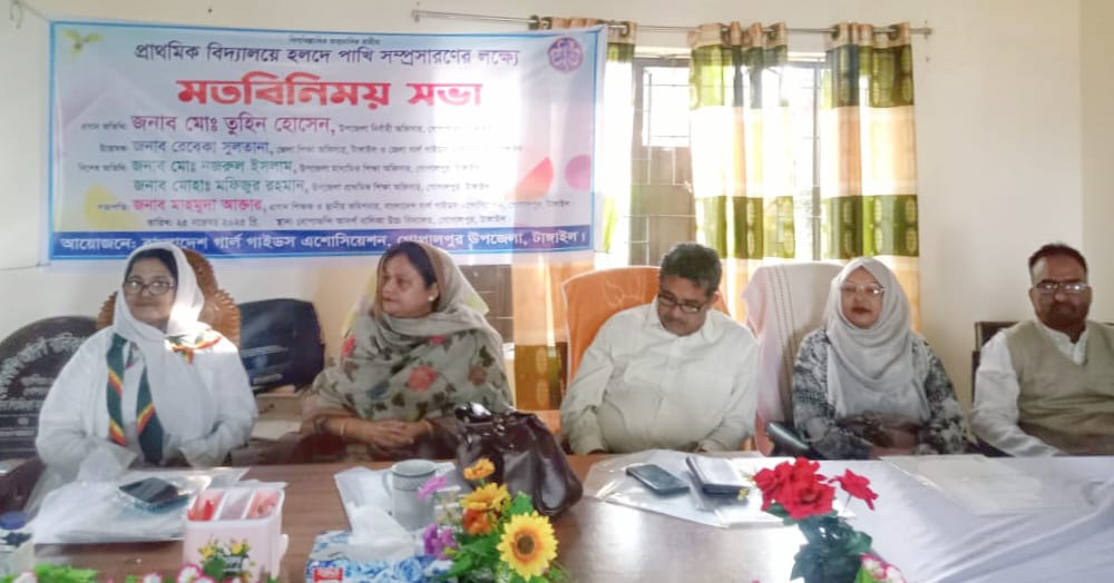 টাঙ্গাইল প্রতিনিধি: টাঙ্গাইলের গোপালপুর প্রাথমিক বিদ্যালয়ের হলদে পাখি ও উচ্চ মাধ্যমিক বিদ্যালয়ের গার্লস গাইড সম্প্রসারণের লক্ষ্যে মতবিনিময় সভা অনুষ্ঠিত হয়েছে।২৫ নভেম্বর মঙ্গলবার উপজেলার ধোপাকান্দি আদর্শ উচ্চ বিদ্যালয় মিলনায়তনে অনুষ্ঠিত সভার উদ্বোধক ও প্রধান অতিথি ছিলেন জেলা শিক্ষা অফিসার ও জেলা গার্লস গাইড এসোসিয়েশন টাঙ্গাইল রেবেকা সুলতানা।
