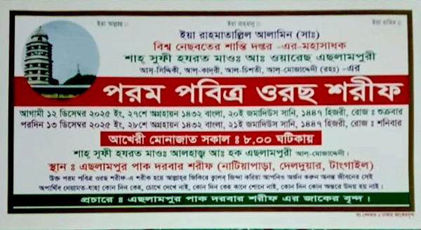 নিজস্ব প্রতিবেদক: টাঙ্গাইলের দেলদুয়ার উপজেলার নাটিয়াপাড়া এলাকায় অবস্থিত এছলামপুর পাক দরবার শরীফে আগামী ১২ ও ১৩ ডিসেম্বর দুই দিনব্যাপী পবিত্র ওরছ শরীফ অনুষ্ঠিত হবে। ইয়া রহমানির আলামিন (সা.)–এর বিনম্র ভালোবাসায় আয়োজিত এ বার্ষিক ওরছকে কেন্দ্র করে ইতোমধ্যে সব প্রস্তুতি সম্পন্ন করেছে দরবার কর্তৃপক্ষ।