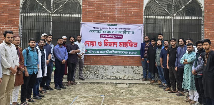 নিজস্ব প্রতিনিধি: আজ ২ ডিসেম্বর,২০২৫ ইং তারিখে বাংলাদেশ জাতীয়তাবাদী ছাত্রদল কেন্দ্রঘোষিত কর্মসূচীর অংশ হিসাবে শহীদ সোহরাওয়ার্দী মেডিকেল কলেজ ছাত্রদলের উদ্যোগে বাংলাদেশের সাবেক তিন বারের নির্বাচিত প্রধানমন্ত্রী এবং দেশনেত্রী বেগম খালেদা জিয়ার সুস্বাস্থ্য ও রোগমুক্তি কামনায় দোয়া মাহফিল আয়োজন করা হয়। বাদ জোহর কলেজ মসজিদে আয়োজিত এ মিলাদ মাহফিলে কেন্দ্রীয় প্রতিনিধি হিসাবে উপস্থিত ছিলেন অত্র প্রতিষ্ঠানের সাবেক শিক্ষার্থী এবং জাতীয়তাবাদী ছাত্রদল কেন্দ্রীয় সংসদের অন্যতম সহ-সভাপতি ডা: তৌহিদুর রহমান আউয়াল।