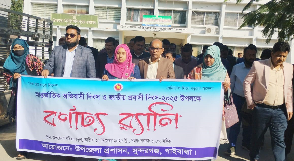 শহীদুল ইসলাম শহীদ (গাইবান্ধা) প্রতিনিধি: ”দক্ষ হয়ে যাবো বিদেশ, রেমিট্যান্স দিয়ে গড়বো স্বদেশ” এই প্রতিপাদ্যকে সামনে রেখে গাইবান্ধার সুন্দরগঞ্জে আর্ন্তজাতিক অভিবাসী দিবস ও জাতীয় প্রবাসী দিবস পালিত হয়েছে। বৃহস্পতিবার (১৮ ডিসেম্বর) সকাল ১০ টায় উপজেলা প্রশাসনের আয়োজনে দিবসটি উপলক্ষে উপজেলা পরিষদ চত্বর থেকে একটি বর্ণাঢ্য র্যালি বের হয়ে প্রধান প্রধান সড়ক প্রদক্ষিণ শেষে পুনরায় একই স্থানে এসে শেষ হয়। এরপর উপজেলা প্রশাসনের আয়োজনে সম্মেলন কক্ষে আলোচনা সভা অনুষ্ঠিত হয়।