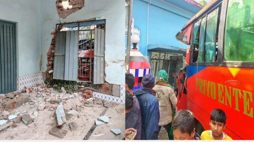 কাজিপুরে প্রিয় এন্টারপ্রাইজ বাসের ধাক্কায় ভ্যানচালক আহত, মসজিদের দেয়াল ভেঙে ঢুকে পড়ল বাস