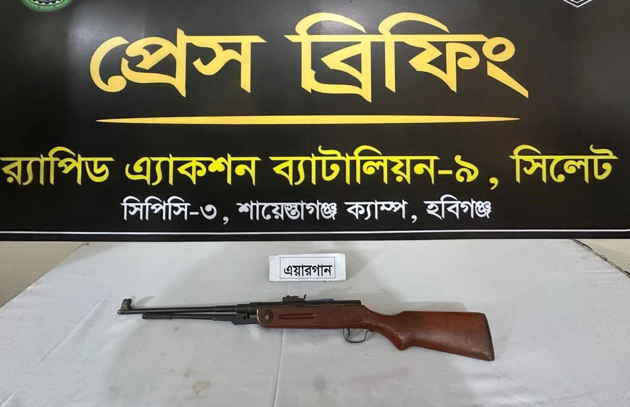 স্বপন রবি দাশ (হবিগঞ্জ) প্রতিনিধি: হবিগঞ্জের শায়েস্তাগঞ্জে ঝোপের ভেতর থেকে একটি পরিত্যক্ত এয়ারগান উদ্ধার করেছে র্যাপিড অ্যাকশন ব্যাটালিয়ন (র্যাব)–৯। শনিবার (১০ জানুয়ারি) দিবাগত রাতে গোপন সংবাদের ভিত্তিতে এ অভিযান পরিচালনা করা হয়।রবিবার (১১ জানুয়ারি) গণমাধ্যমে পাঠানো এক সংবাদ বিজ্ঞপ্তিতে বিষয়টি নিশ্চিত করেছেন র্যাব–৯, সিলেটের মিডিয়া অফিসার অতিরিক্ত পুলিশ সুপার কে এম শহিদুল ইসলাম সোহাগ।