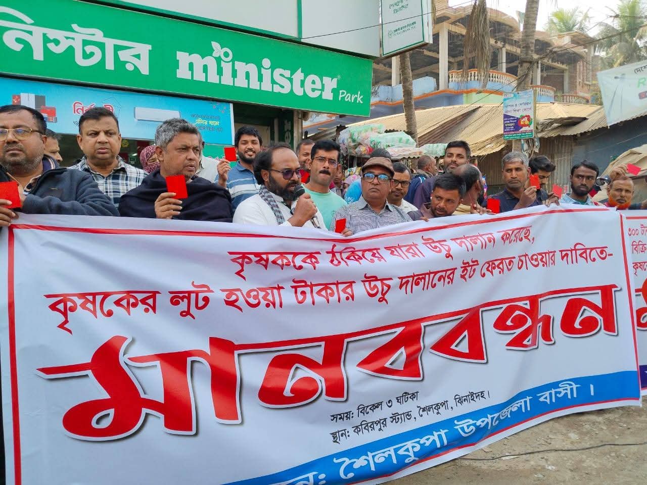 শনিবার (১৭ জানুয়ারি) দুপুরে উপজেলার কবিরপুর তিন রাস্তার মোড়ে ‘শৈলকুপাবাসী’র ব্যানারে আয়োজিত এই কর্মসূচিতে শতাধিক কৃষক অংশ নেন। এ সময় সার সিন্ডিকেটে জড়িতদের বিরুদ্ধে প্রতীকী লাল কার্ড প্রদর্শন করে পাঁচ দফা দাবি উত্থাপন করা হয়।