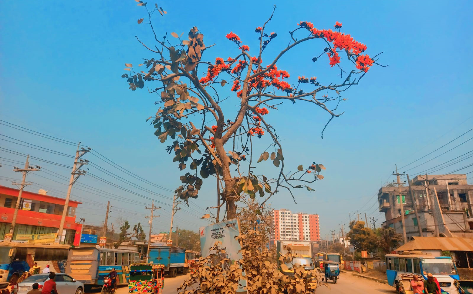 এক সময় গ্রামবাংলার আঁকাবাঁকা পথ, বাগান কিংবা ফাঁকা মাঠের ধারে পলাশের দেখা মিলতো। এখন সেই চিত্র অনেকটাই বদলে গেছে। শহরায়ণ আর বৃক্ষ নিধনের কারণে পলাশ যেন ধীরে ধীরে হারিয়ে যাচ্ছিল। এমন অবস্থায় মহাসড়কের ডিভাইডারে পলাশ রোপণ নতুন করে ফিরিয়ে এনেছে বসন্তের রঙ।পাতাঝরা ডালে ফুলেল পোশাক পরে দাঁড়িয়ে থাকা পলাশ যেন মনে করিয়ে দেয়-ঋতুরাজ বসন্ত এসে গেছে। ব্যস্ত মহাসড়কের একঘেয়ে দৃশ্যের মাঝে এই আগুনরাঙা ছোঁয়া এখন পথিকের চোখে স্বস্তি, মনে আনন্দ।