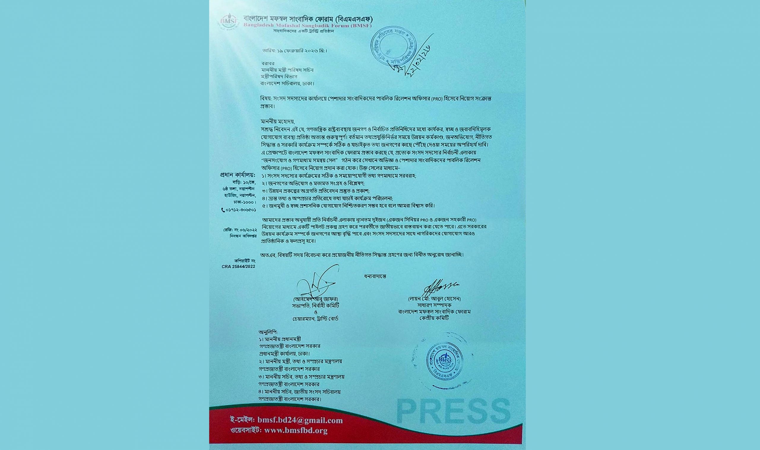 প্রস্তাবনায় প্রতি নির্বাচনী এলাকায় ন্যূনতম দুইজন (একজন সিনিয়র PRO ও একজন সহকারী PRO) নিয়োগ দিয়ে পাইলট প্রকল্প গ্রহণের সুপারিশ করা হয়েছে। এতে সংসদ সদস্যদের কার্যক্রমের নিয়মিত তথ্য সরবরাহ, জনমত সংগ্রহ ও বিশ্লেষণ, উন্নয়ন প্রকল্পের অগ্রগতি প্রতিবেদন প্রকাশ এবং ভ্রান্ত তথ্য প্রতিরোধ কার্যক্রম আরও কার্যকর হবে বলে সংগঠনটি মনে করে।চিঠির অনুলিপি মাননীয় প্রধানমন্ত্রী, প্রধানমন্ত্রী কার্যালয়, তথ্য ও সম্প্রচার মন্ত্রণালয় এবং জাতীয় সংসদ সচিবালয়ে প্রেরণ করা হয়েছে।সংগঠনের সভাপতি আহমেদ আবু জাফর ও সাধারণ সম্পাদক লায়ন মো: আবুল হোসেন স্বাক্ষরিত প্রস্তাবে বিষয়টি সদয় বিবেচনার জন্য সরকারের প্রতি অনুরোধ জানানো হয়েছে।