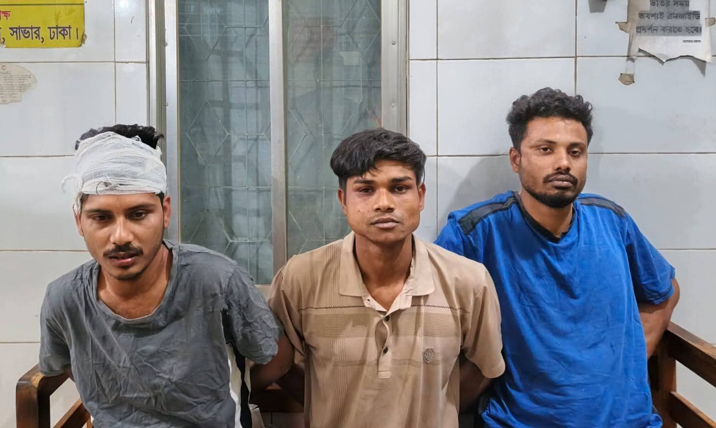 এসময় উত্তেজিত জনতা তাদের গণধোলাই দেয়। পরে জাতীয় জরুরি সেবা ৯৯৯-এ ফোনের মাধ্যমে বিরুলিয়া পুলিশ ফাঁড়ির এসআই আল আমিন সঙ্গীয় ফোর্স সহ ঘটনাস্থলে পৌঁছে আসামিদের হেফাজতে নেন। ​গ্রেপ্তারকৃতরা হলেন: ​১. মো. শাহিনুর ইসলাম (২৮) – বর্তমান ঠিকানা: টঙ্গাবাড়ী, আশুলিয়া (স্থায়ী: তারগঞ্জ, রংপুর) ২. শ্রী মিট্টু কুমার শীল (২৩) – বর্তমান ঠিকানা: টঙ্গাবাড়ী, আশুলিয়া (স্থায়ী: শেরপুর, বগুড়া) ৩. মো. সজিব (২৭) – সামাইর, বিরুলিয়া। ​পুলিশের ভাষ্য ও উদ্ধারকৃত আলামত ​আসামিদের তল্লাশি করে তাদের কাছ থেকে ১৩ ইঞ্চি ও ১০ ইঞ্চি লম্বা দুটি কাঠের বাটযুক্ত স্টিলের চাকু উদ্ধার করা হয়েছে। পুলিশ জানায়, ঘটনার পর আহত আসামিদের ও চালককে সাভার উপজেলা স্বাস্থ্য কমপ্লেক্সে নিয়ে প্রাথমিক চিকিৎসা দেওয়া হয়েছে। ​আজ (৪ মার্চ) চালক শাহীন মিয়া বাদী হয়ে সাভার মডেল থানায় একটি লিখিত এজাহার দায়ের করেছেন। আসামিদের বিরুদ্ধে নিয়মিত মামলা দায়েরের প্রক্রিয়া সম্পন্ন হয়েছে বলে জানিয়েছে পুলিশ।
