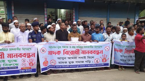 কিশোরগঞ্জে মাদকের বিরুদ্ধে যুবসমাজ ও গ্রামবাসীর মানববন্ধন