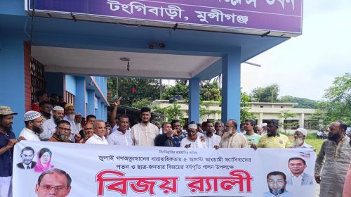 টঙ্গীবাড়ী প্রতিনিধি: জুলাই গণঅভ্যুত্থানের ধারাবাহিকতায় ৫ আগস্ট আওয়ামী ফ্যাসিবাদের পতন ও ছাত্র-জনতার বিজয়ের বর্ষপূর্তি উপলক্ষে মুন্সীগঞ্জের টঙ্গীবাড়ীতে বিজয় র্যালী অনুষ্ঠিত হয়েছে। টঙ্গীবাড়ী উপজেলা বিএনপি ও অন্যান্য অঙ্গ সংগঠনের আয়োজনে উপজেলা…